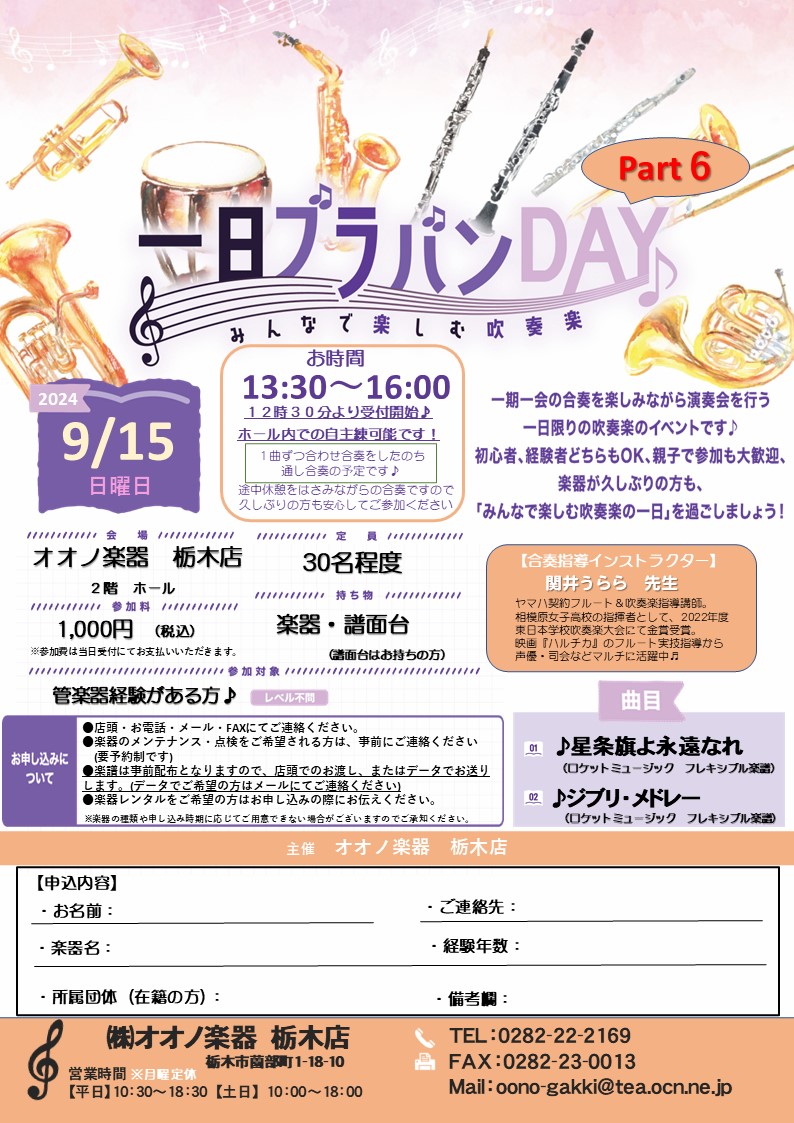 ♪日にち:9月15日 ♪時間 :13時30分~16時まで(12時半から受付開始) ♪場所 :オオノ楽器栃木店 2階ホール ♪楽曲 :星条旗よ永遠なれ・ジブリメドレー